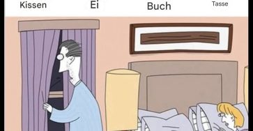 Kannst du das Buch, das Ei, die Tasse und das Kissen entdecken?