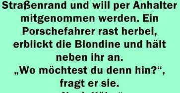 Eine Blondine steht am Straßenrand und will per Anhalter mitgenommen werden. Ein Porschefahrer rast herbei, erblickt die Blondine und hält…